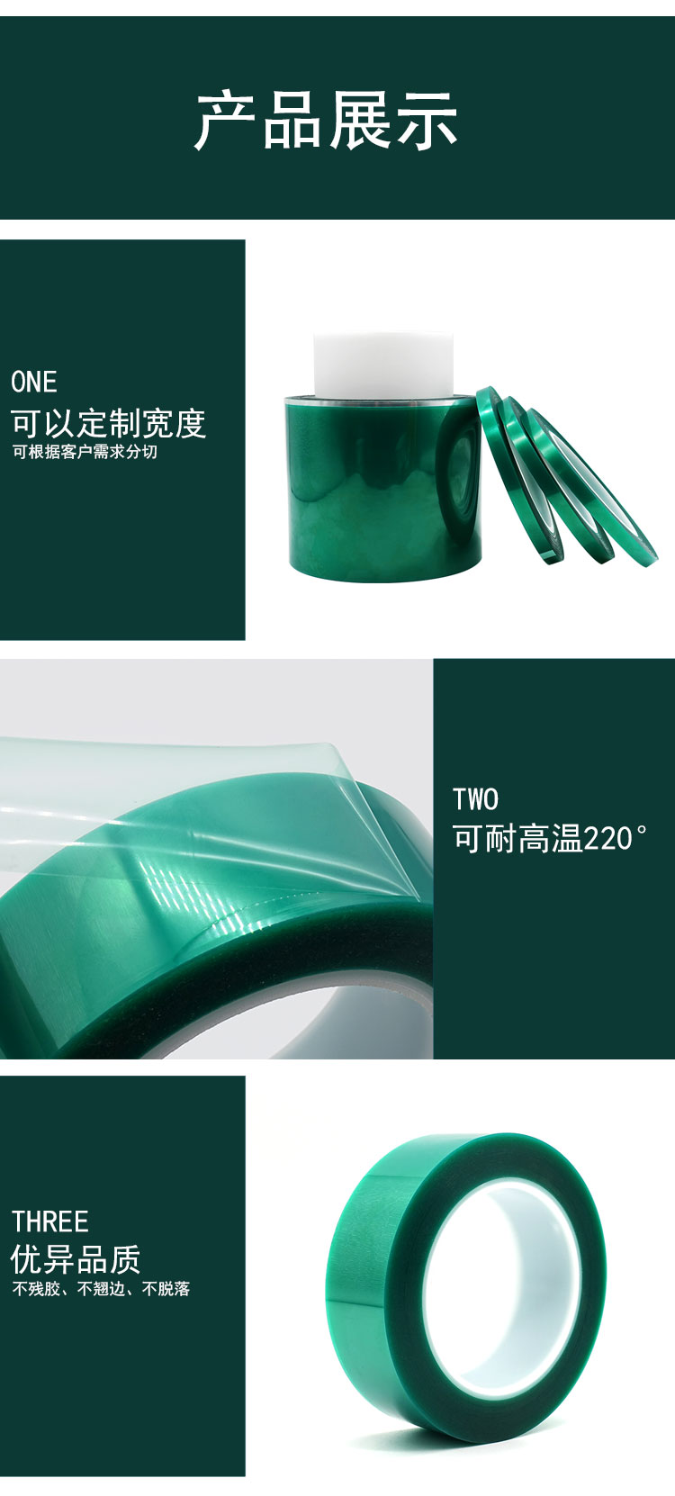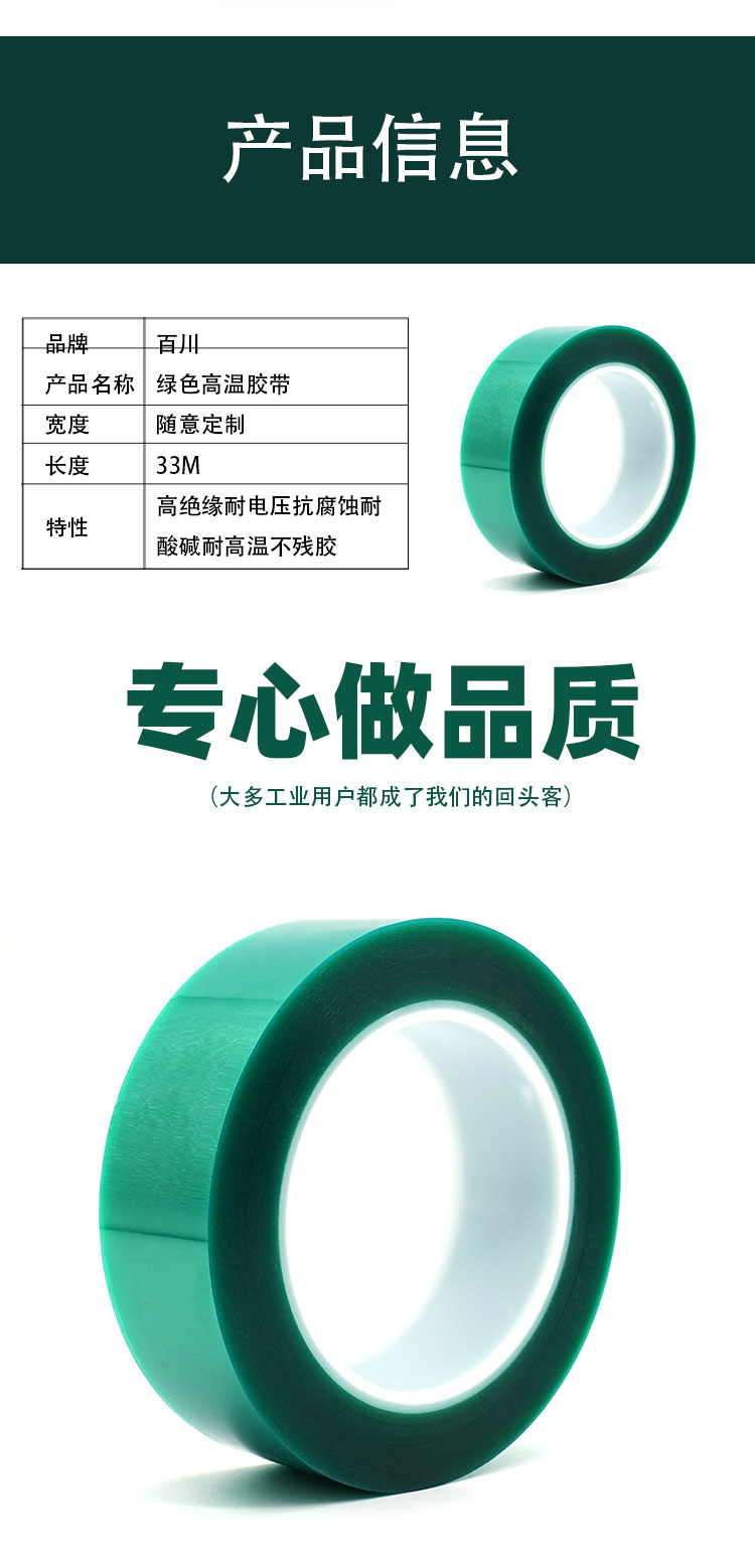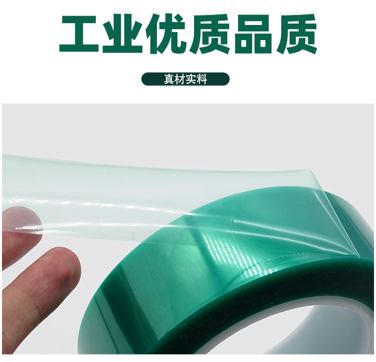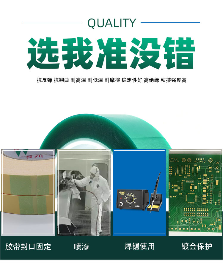 該膠帶膠紙以柔軟PET聚酯薄膜為基材,單面涂布高性能有機(jī)硅壓敏膠而成。主要用做高溫環(huán)境工作表面處理遮蔽保護(hù),電鍍,電泳、超高溫烤漆、粉末噴涂及晶片元件端電極使用等